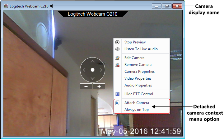 Detached camera window title will show the Display name selected for your camera. This will help you to identify the camera, even if the application is minimized or the camera preview fails. When the camera is detached the following context menu options will appear in addition to the existing ones:
