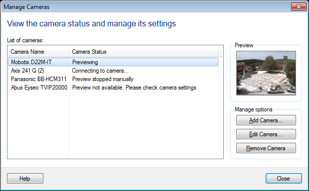 In Manage Camera dialog, you can view the status of each camera you have added. You can easily manage multiple cameras by using options like Add, Edit and Remove. To open the Manage Camera dialog, click Camera >> Manage Cameras.
