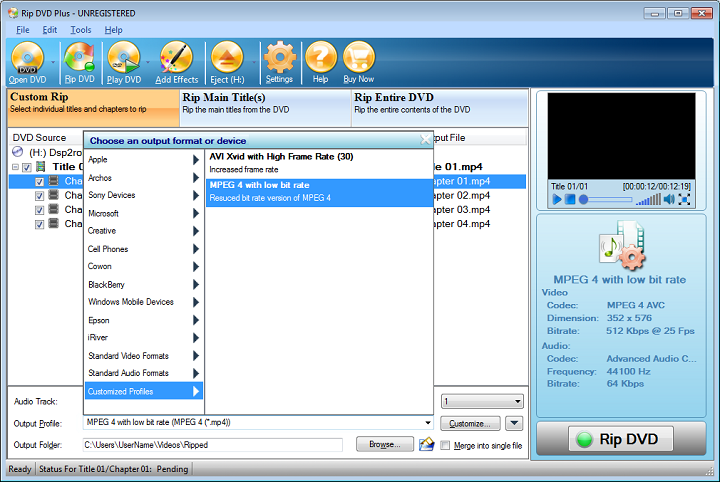 There are certain profiles and formats available to rip DVD content to play on many popular devices. The defaults produce high quality and small size video and audio files. Whenever you change the settings for a particular output profile, save it as a Custom Profile. This profile can then be used to rip other DVDs using the same options.