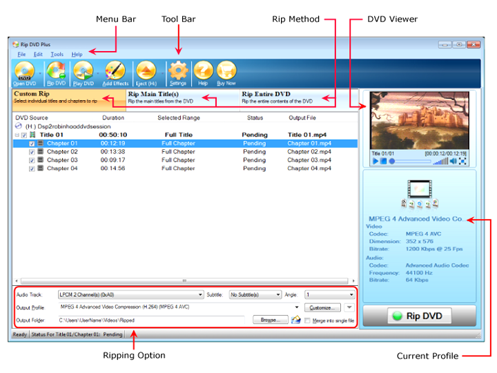 Quickly access the most important and commonly used features from the Tool Bar. You can load the DVD files, rip the DVDs to play on any device, and play the DVDs in the built-in viewer. In addition, you may add various effects like color, brightness, contrast etc. to personalize the videos.