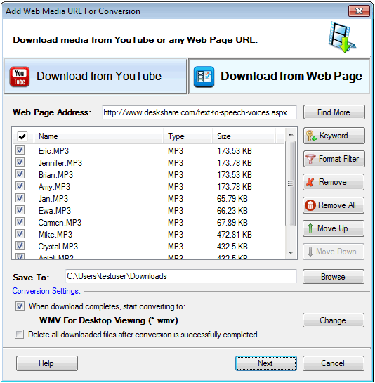 | Digital Media Converter Pro: Ajouter des fichiers multimédia à partir de pages Web | Ajouter des fichiers multimédiasd'une page Web Il est très facile de télécharger des fichiers multimédias à partir Digital Media Converter Pro Page Web à l'aide. Vous pouvez ajouter du contenu multimédia sur le web ou simplement la conversion d'affichage. Pour télécharger des fichiers multimédias à partir de la page Web, cliquez sur Fichier>> Ajouter Web Media>> Télécharger à partir de la page Web Vous pouvez rechercher et télécharger des fichiers multimédias depuis n'importe quelle page Web. Entrez le URL de la page Web et cliquez sur le Rechercher bouton.Digital Media Converter Pro Se met à rechercher les fichiers médias dans l'URL saisie et les ajouter à la liste. Si la page Web que vous avez entré contient des liens vers de nombreux supports différents fichiers, vous pouvez filtrer sur plusieurs mots clés séparés par un point virgule (;). Par exemple, si vous entrez des mots clés comme Michael Jackson, 1984 puis il va rechercher les fichiers multimédia avec un nom contenant les Michael Jackson ou 1984 . Vous pouvez également rechercher les fichiers multimédia en sélectionnant les formats de fichiers comme les filtres, il va rechercher les fichiers que du format donné. Téléchargement Media Lorsque vous avez terminé la recherche des URL des médias, cliquez sur Suivant bouton pour démarrer le téléchargement des fichiers. |