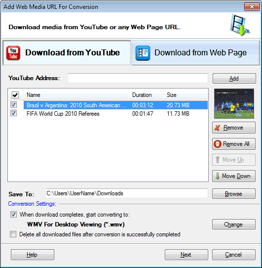 | Digital Media Converter Pro: Ajouter des fichiers multimédia à partir de YouTube | Ajouter des fichiers multimédiasà partir de YouTube Il est très facile de télécharger des fichiers multimédias à partir de YouTube en utilisant Digital Media Converter Pro. Vous pouvez ajouter du contenu multimédia sur le web ou simplement la conversion d'affichage. Pour télécharger des fichiers multimédias à partir de YouTube, cliquez sur Fichier>> Ajouter des médias sur le Web  Pour télécharger une vidéo YouTube, saisissez son URL et cliquez sur le Ajouter bouton.Cela va extraire les informations des fichiers multimédia comme les Nom du fichier, durée, taille etVignette puis l'ajouter pour le téléchargement. Paramètres de conversion Une fois le téléchargement terminé, lancer la conversion à: Lorsque cette option est cochée, il ajoutera automatiquement les fichiers téléchargés dans la liste de conversion et va commencer la conversion au format sélectionné quand le téléchargement est terminé avec succès. Vous pouvez modifier le format de fichier de sortie et de ses Paramètres de conversion en cliquant sur modifier un bouton. Supprimer tous les fichiers téléchargés après la conversion est terminée avec succès: Si cette option est cochée, alors tous les fichiers téléchargés seront supprimés après sa conversion réussie. Téléchargement Media Lorsque vous avez terminé la recherche des URL des médias, cliquez sur Suivant bouton pour démarrer le téléchargement des fichiers. |