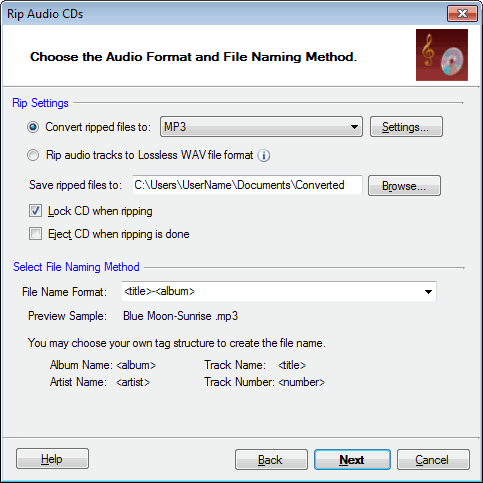 Utilisation Format de nom de fichier Pour choisir comment vous souhaitez nommer les fichiers audio créés. Le réglage par défaut est approprié: les joueurs audio les plus personnels listent les chansons par leur titre et non par le nom du fichier.