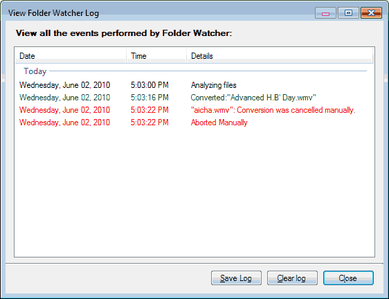 Si l'application ne fonctionne pas à l'heure programmée, elle est lancée par l'outil Folder Watcher pour lancer la conversion. Étant donné que l'application reste sans surveillance, tous les événements importants de Folder Watcher sont enregistrés afin que vous puissiez garder une trace. Pour afficher ces événements, cliquez sur Afficher le journal bouton.