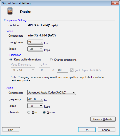 Vos fichiers multimédias sont convertis au format MPEG-4. le Intel (R) H.264 (AVC) Le compresseur prend moins d'e que les autres compresseurs pour la même qualité. La fréquence d'images est configurée pour 24 Fps Et bitrate est 1200 Kbps. Vous pouvez choisir de conserver ou de modifier les dimensions de la vidéo.