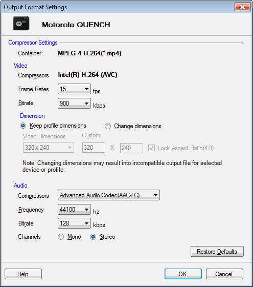 Vos fichiers multimédias sont convertis au format MPEG-4. le Intel (R) H.264 (AVC) Le compresseur prend moins d'e que les autres compresseurs pour la même qualité.La fréquence d'images est configurée pour 25 Fps Et bitrate est 512 Kbps. Vous pouvez choisir de conserver ou de modifier les dimensions de la vidéo.