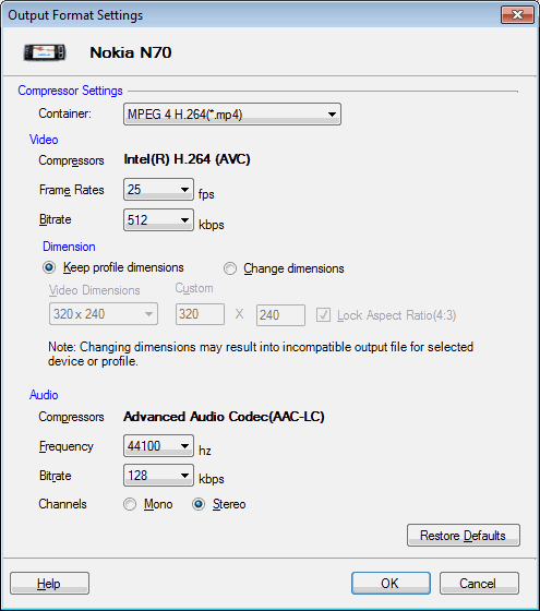 Vos fichiers multimédias sont convertis au format MPEG-4. le Intel (R) H.264 (AVC) Le compresseur prend moins d'e que les autres compresseurs pour la même qualité. La fréquence d'images est configurée pour 25 Fps Et bitrate est 512 Kbps. Vous pouvez choisir de conserver ou de modifier les dimensions de la vidéo.
