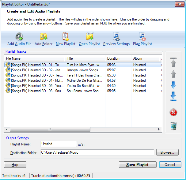 Créez une liste de morceaux à lire en continu dans un ordre particulier. La playlist est créée au format M3U et peut être lue avec Windows Media Player et QuickTime Player. La plupart des lecteurs portables populaires tels que RIM BlackBerry, Sony PSP et beaucoup d'autres peuvent jouer à vos playlists M3U.