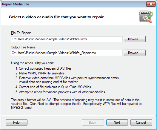 L'outil Repair Media tente de corriger et réparer tout problème qu'il pourrait trouver dans ces fichiers multimédias. L'outil peut réparer les en-têtes endommagés des fichiers AVI, récupérer des données vidéo à partir de fichiers MPEG avec des erreurs de synchronisation de paquets ou des données invalides. Il peut corriger les problèmes qui se produisent dans les fichiers MOV QuickTime et réparer les fichiers WMV ou WMA corrompus qui ne peuvent être recherchés.