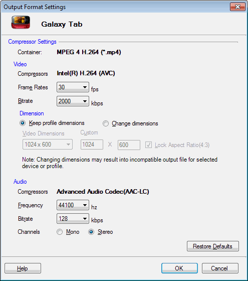 Il s'agit d'un exemple de profil de périphérique vidéo Samsung Galaxy Tab.