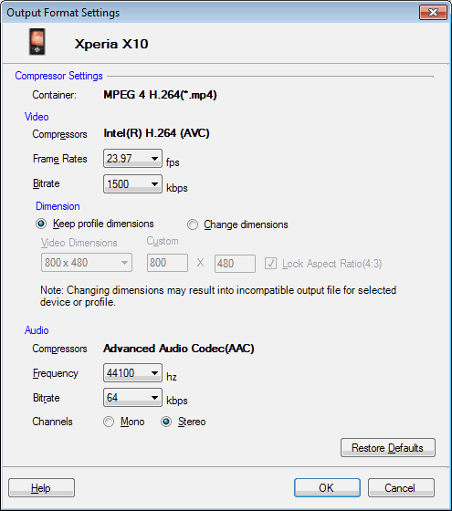 Cliquez Formats >> Sélectionnez les profils de périphérique >> Sony Ericsson >> ( Sélectionnez le profil souhaité de l'appareil ).