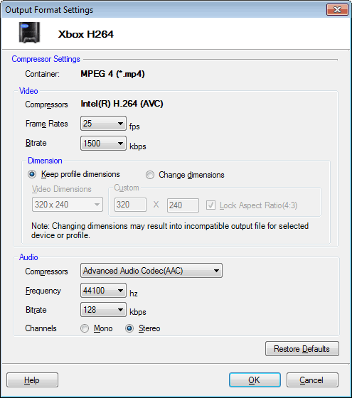 C'est un exemple d'une Xbox H264 Profil de périphérique vidéo. Cliquez Formats >> Sélectionnez les profils de périphérique >> Consoles de jeux >> Xbox H264.