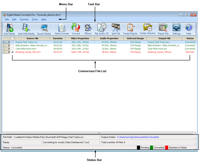 Les fichiers ajoutés pour la conversion sont affichés dans le Liste des fichiers. Ces fichiers sont affichés avec la durée, les propriétés audio et vidéo, la plage du fichier, le fichier de sortie et l'état de la conversion. Le statut peut être interrompu, en attente ou converti.