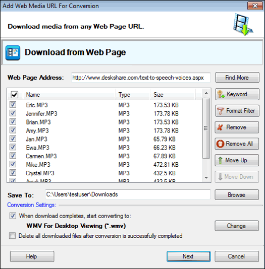 Entrer le URL de la page Web Et cliquez sur le Chercher bouton. Les fichiers multimédias sont recherchés et sont ajoutés dans la liste.