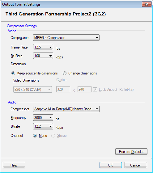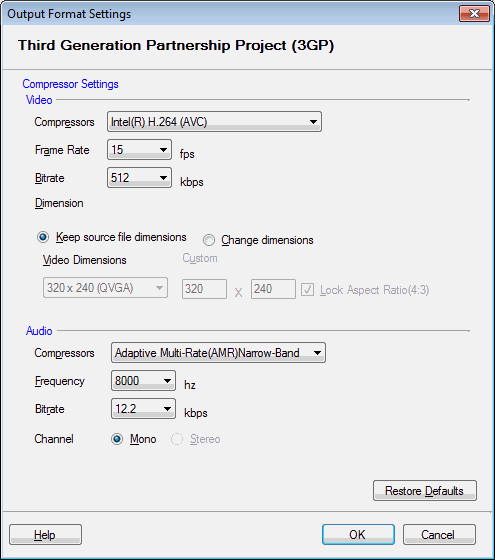 le Adaptive Multi-Rate (AMR) Narrow-Band Est adopté comme codec de lecture standard pour le format 3GP. Il offre une meilleure qualité et plus de couverture cellulaire.AAC est uniquement pris en charge par certains périphériques plus récents. La qualité du son est bien meilleure lors de l'utilisation de ce compresseur - mais vous devez vérifier si votre appareil le supporte. La fréquence est réglée sur 8000 Hz et Bitrate à 12.2 Kbps. Mono Le canal audio produit de petits fichiers, mais l'audio est entendu à un niveau sonore constant.