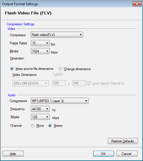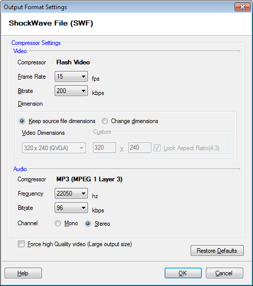 Par défaut, le compresseur sélectionné est Vidéo Flash. La fréquence d'images est fixée à 15 images par seconde, Bitrate à 200 kbps. Vous pouvez choisir de conserver ou de modifier les dimensions de la vidéo.