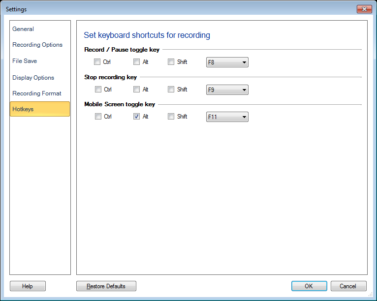 Vous avez également la possibilité de choisir soit Ctrl, Alt ou Décalage touche avec la touche fonctionnelle sélectionnée. Par exemple, vous pouvez utiliser Ctrl + F12 à la place du F9 touche de raccourci vers Arrêtez votre enregistrement d'écran.