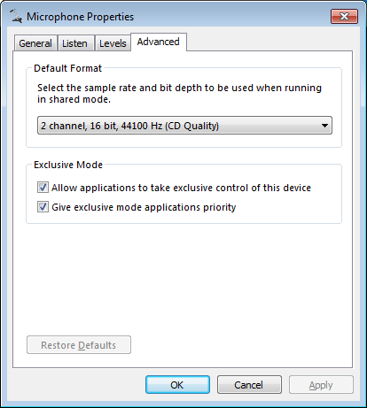 2.Cliquer sur Avancée onglet et vérifiez la section 'Format par défaut' pour la fréquence d'échantillonnage et la profondeur de bits. Le microphone et les haut-parleurs doivent avoir les mêmes réglages de fréquence d'échantillonnage et de profondeur de bits.