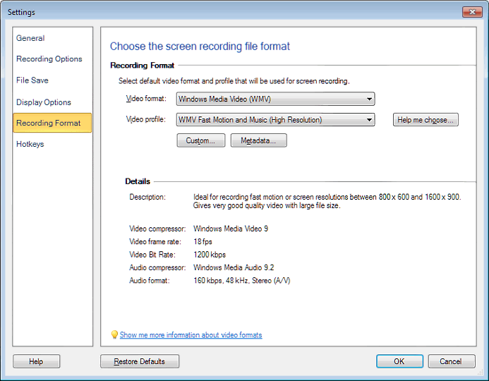 Pour les deux formats, vous pouvez choisir un Profil vidéo. Chaque profil équilibre la taille du fichier en fonction de la qualité vidéo et audio. La valeur par défaut est WMV Motion et musique (haute résolution). Les enregistrements réalisés avec ce profil sont généralement indiscernables de l'écran d'origine. Si la taille du fichier est critique, vous pouvez réduire la qualité, et si vous avez besoin d'une qualité extrêmement élevée avec des tailles d'image et des résolutions d'écran très élevées, vous pouvez l'augmenter. Notez qu'un profil de qualité inférieure est susceptible de bien fonctionner si vous enregistrez seulement un petit Région, parce qu'il y a moins d'informations à sauvegarder.