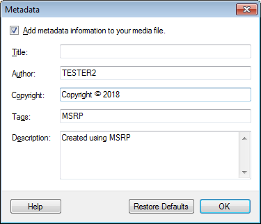 Vous pouvez ajouter Métadonnées aux fichiers WMV et WMA. Les métadonnées sont des informations supplémentaires sur l'enregistrement visible dans le lecteur lors de la lecture du fichier. Pour ajouter des métadonnées, cliquez sur Métadonnées bouton. My Screen Recorder prend en charge les éléments de métadonnées suivants: