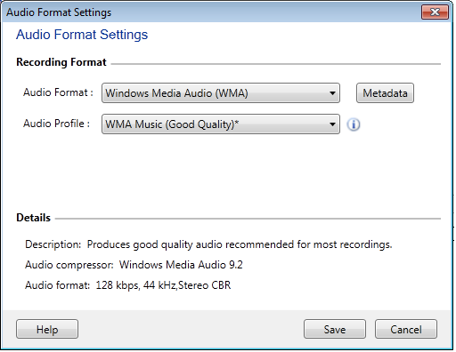 Sélectionnez un Profil audio. Généralement, les paramètres de qualité inférieure sont suffisants pour l'enregistrement uniquement vocal, tandis que les profils de qualité supérieure doivent être utilisés si la musique est en cours d'enregistrement. Vous pouvez créer votre propre profil audio en sélectionnant le Profil personnalisé option dans la liste déroulante. Formats de fichiers personnalisés sont disponibles pour WMA et MP3 enregistrement.