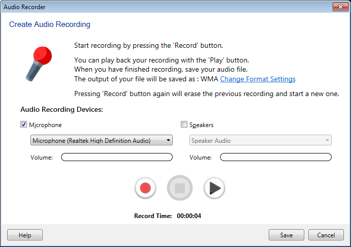 Réglez le volume d'enregistrement à l'aide du curseur. Créez votre enregistrement audio en utilisant le Enregistrer / Pause, Arrêtez et Jouer boutons. Utilisez le Jouer bouton pour vérifier le fichier enregistré. Sélectionnez un nom pour votre enregistrement audio et choisissez un dossier dans lequel enregistrer.