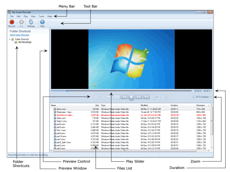 - Les enregistrements d'écran sont sauvegardés en tant que fichiers WMV ou AVI et sont affichés dans le Liste de fichiers.
