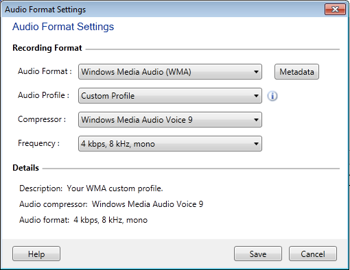 - Format: Plus les paramètres de format audio sont élevés, meilleure est la qualité audio. Généralement, lorsque vous utilisez le Voix compresseur, la voix enregistrée est compréhensible à des paramètres aussi bas que 5 kbps et peut sonner bien à 12 kbps. Pour enregistrer en utilisant le Windows Media Audio 9.2 compresseur, vous devez régler au moins 24 kbps, et pour enregistrer de la musique, 48 kbps. Vous pouvez expérimenter pour déterminer la valeur la plus faible qui produit une qualité acceptable.
