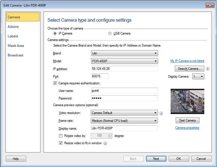 - Sélectionnez l' Modifier une caméra option. La boîte de dialogue suivante apparaît: