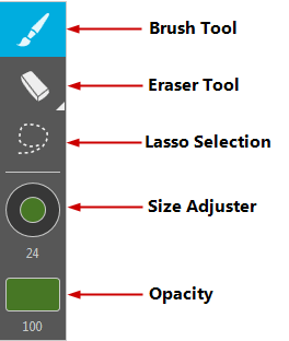Freehand Painter die Symbolleiste verfügt über eine einstellbare Pinsel, Radiergummi und Lasso-Auswahl. Die Farbgruppe ist am unteren Rand des Arbeitsbereichs.