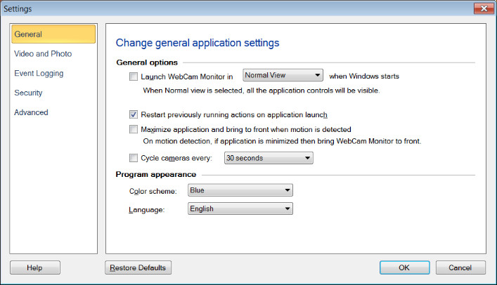 Il Generale Sezione del Impostazioni dell'applicazione La finestra di dialogo controlla il comportamento del programma quando viene lanciato per la prima volta, l'aspetto generale dell'applicazione e il salvataggio di video e foto.