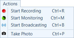 - Menu Azioni: Avviare rapidamente azioni come la registrazione video, il monitoraggio e la trasmissione per la telecamera selezionata.