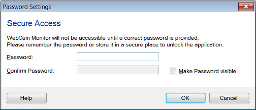 Impostare una password e nessuno cambierà le impostazioni delle applicazioni senza il tuo consenso. Le telecamere saranno disponibili per l'utente per l'anteprima. Una volta che l'applicazione è bloccata, l'utente non sarà autorizzato a chiudere Webcam Monitor. La selezione di questa funzione blocca le impostazioni dell'applicazione ok clic. Una volta che l'utente sblocca l'applicazione, la Accesso sicuro L'opzione sarà disattivata.
