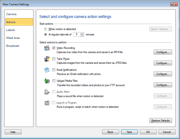 Fare clic destro sull'anteprima della telecamera, selezionare Modifica fotocamera >> Azioni E selezionare A intervalli regolari di n minuti (s) opzione.