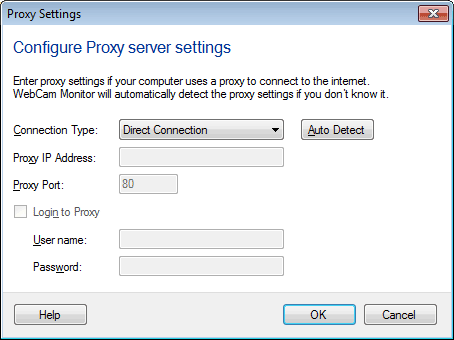WebCam Monitor richiede una connessione a Internet per le opzioni di monitoraggio remoto come emittente e Caricare O per il Notifica per email mettere in guardia. Se si connette a Internet tramite un server proxy, è necessario configurarlo in WebCam Monitor per inviare, caricare o inviare una e-mail.