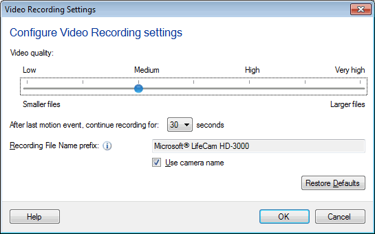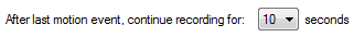 Specificare la durata della registrazione in secondi che si desidera registrare dopo il rilevamento del movimento. Per impostazione predefinita, 5 secondi di registrazione di buffer saranno sempre aggiunti da WebCam Monitor. SPAZIOQuesto ti permette di testimoniare che cosa ha innescato l'attività di movimento. Dopo il rilevamento del movimento, il video verrà registrato per l'ora selezionata Dopo l'ultimo evento di movimento, continuare la registrazione per N secondi opzione.