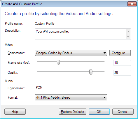 • los Cuadros por segundo es la cantidad de veces que se actualiza una imagen de video por segundo. Las bajas velocidades de cuadro pueden hacer que el movimiento rápido en la pantalla parezca abrupto. Las altas velocidades de cuadro pueden hacer que el video se vea borroso si la velocidad de bits es demasiado baja. Para la mayoría de las aplicaciones de captura de pantalla, las velocidades de fotogramas entre 5 y 10 fps son lo suficientemente altas. Si está grabando un movimiento rápido o capturando la reproducción de video, la calidad se puede mejorar elevando el valor de la velocidad de fotogramas. En un archivo AVI, el aumento de la frecuencia de cuadros resulta en un aumento en el tamaño del archivo. Este no es el caso cuando la grabación se realiza en formato WMV.