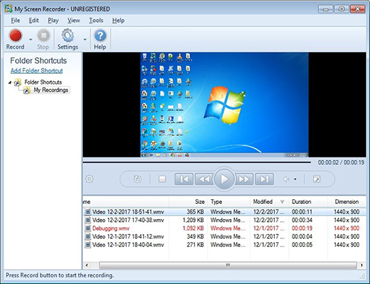 My Screen Recorder captura la actividad del escritorio de tu PC en archivos de video WMV o AVI estándar. Graba todo lo que ve en la pantalla de la computadora, incluido todo el escritorio, las ventanas, los menús, los cursores, incluso el video con sonido. El programa crea archivos de video de alta calidad y tamaño pequeño.Una característica única de My Screen Recorder es la capacidad de capturar el audio de sus altavoces y el micrófono al mismo tiempo.