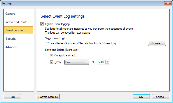 Guardar registro de eventos: De forma predeterminada, los registros de eventos se guardarán en su PC en Documentos >> Webcam Monitor >> Registro de eventos. Tiene la opción de cambiar la carpeta predeterminada haciendo clic en Examinar.