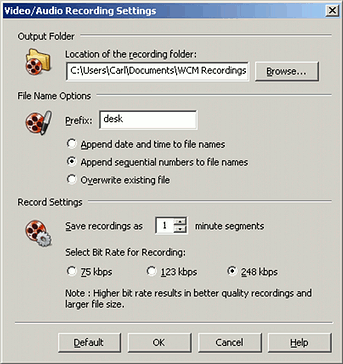 WebCam Monitor Graba video y audio en formatos Windows Media. La extensión de los archivos de vídeo es ". WMV" y la de los archivos de audio es ". WMA". El Video / Audio alerta de grabación de discos de vídeo o audio durante un tiempo especificado cuando el movimiento / ruido es detectado o un intervalo de tiempo especificado se alcanza, o ambos, dependiendo de la categoría de alerta seleccionado.