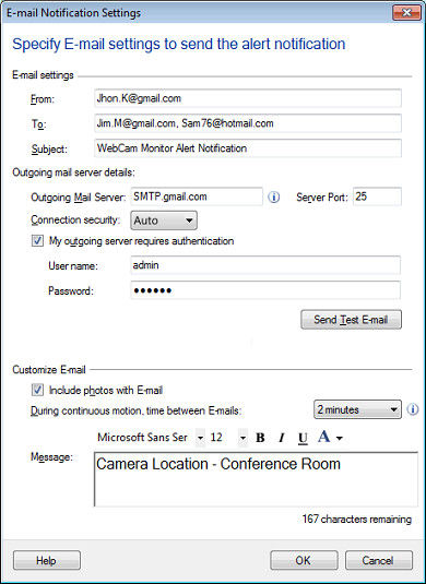 La acción Notificación por correo electrónico es una forma eficaz de supervisar remotamente. Siempre que se active una alerta, ya sea en detección de movimiento o en intervalos regulares, WebCam Monitor le envía inmediatamente un correo electrónico. ESPACIOTambién puede incluir fotos JPEG de la actividad que activó la alerta, dentro del cuerpo de correo electrónico.