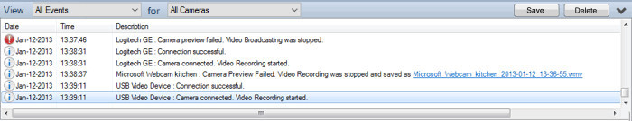 WebCam Monitor está diseñado para ejecutarse desatendido. ESPACIOEl programa registra todos los incidentes importantes para que pueda estar al tanto de la secuencia de eventos cuando revise el Registro más tarde. Los registros se muestran en la Registro de eventos sección. Pueden servir como registros con fines legales y probatorios.