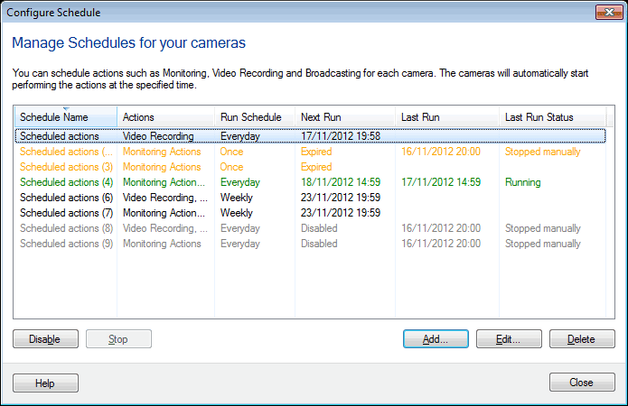 Con la ayuda de WebCam Monitor, puede establecer horarios individuales para cada cámara. ESPACIOPuede programar cada cámara independientemente para realizar diversas acciones, como la supervisión con alertas o grabación de vídeo, captura de fotos y difusión. Usted puede Agregar, Edición Un horario de acuerdo a su necesidad. Si no desea que se ejecute un programa a la hora especificada, Deshabilitar (Cuando el horario no está funcionando) o Detener (Cuando el horario se está ejecutando). Cuando no desee ejecutar una programación en una cámara, seleccione Eliminar.